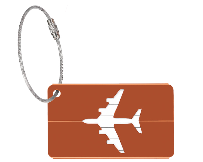 Identificador de equipaje de aluminio con detalle de avión. Cuenta con una pulsera con seguro giratorio hecho de alambre galvanizado recubierto de PVC y una tarjeta para datos personales (español/inglés) con mica protectora.
