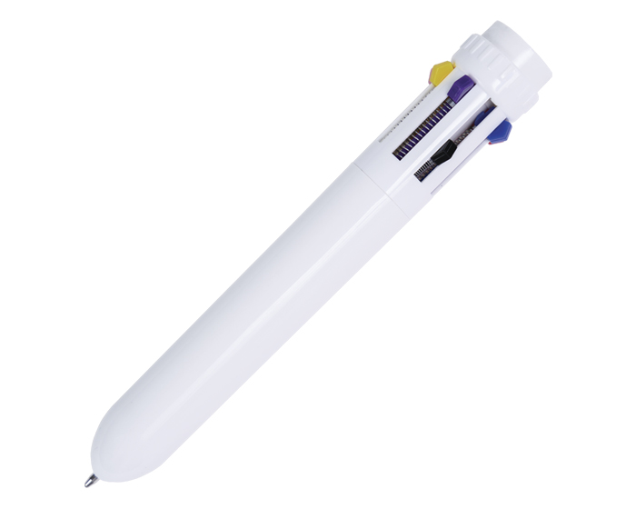 Bolígrafo de plástico multitintas, incluye 8 colores de tinta diferentes.