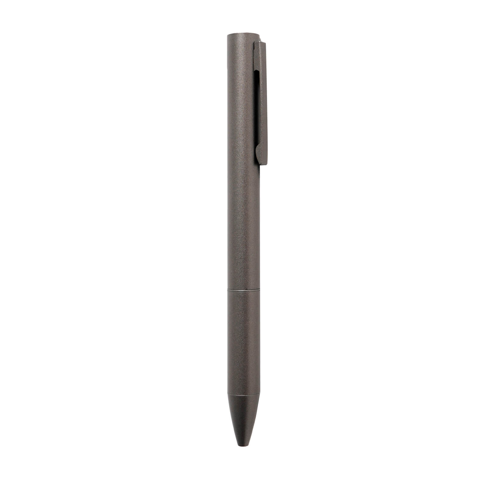 Bolígrafo metálico con clip y mecanismo retráctil.