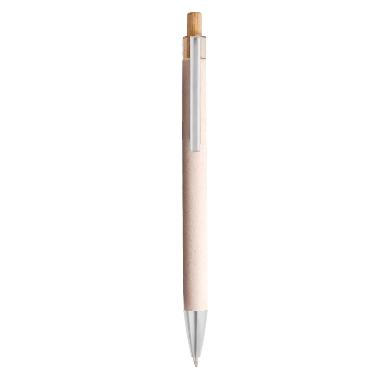 Bolígrafo ecológico elaborado a partir de papel reciclado. Cuenta con clip metálico y mecanismo de click con botón de madera.
