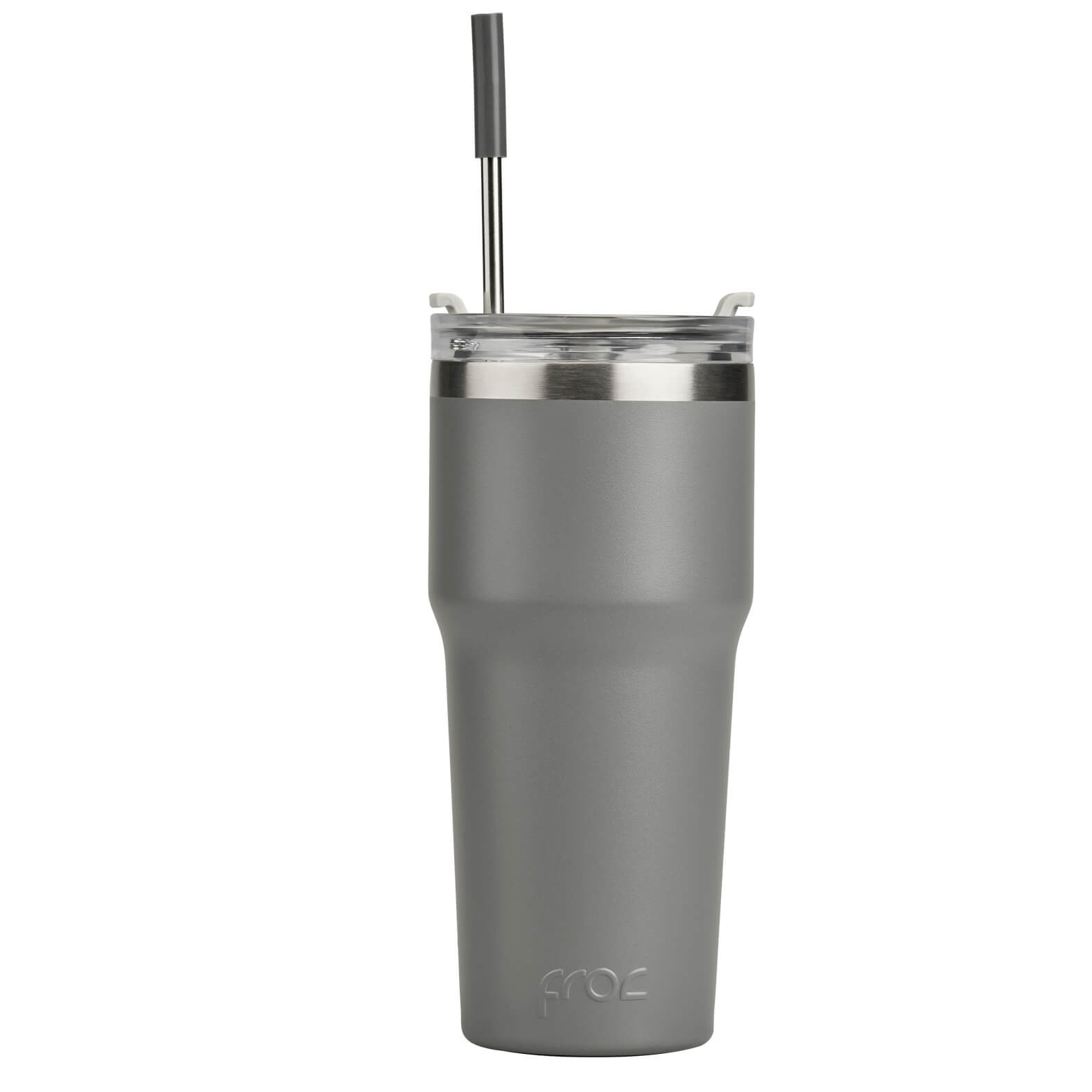 Termo con doble pared de acero inoxidable, insulado al vacio con acabado rugoso, base antiderrapante, tapa de rosca con silicón y popote metálico. (Incluye limpiador para el popote).