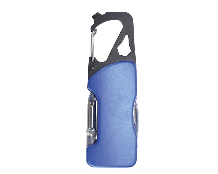 Gancho con clip multifunción que incluye: Luz LED con botón de encendido/apagado, navaja, destapador, llave allen, mini desarmador plano y desarmador de cruz. Incluye 2 baterías de botón. Presentación: caja individual de kraft.