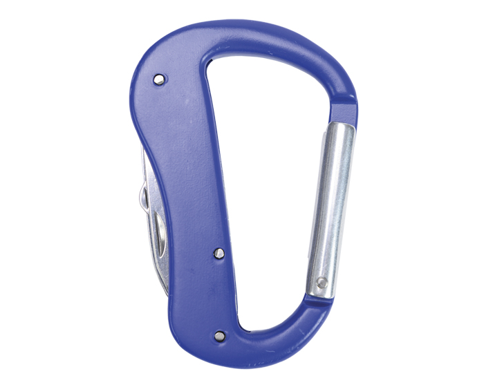 Gancho con clip multifunción que incluye: tijeras, navaja y destapador con lima. Presentación: caja individual de kraft.