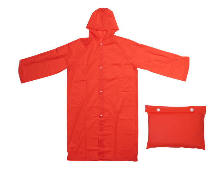Impermeable con botónes. Incluye funda portátil del mismo material con broche de botón. La impresión requiere tinta especial.